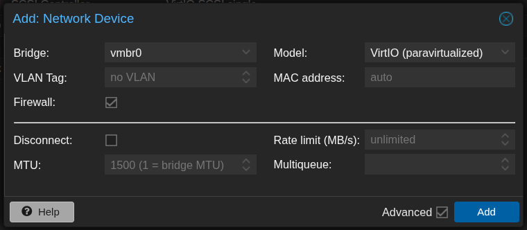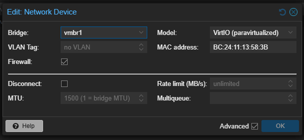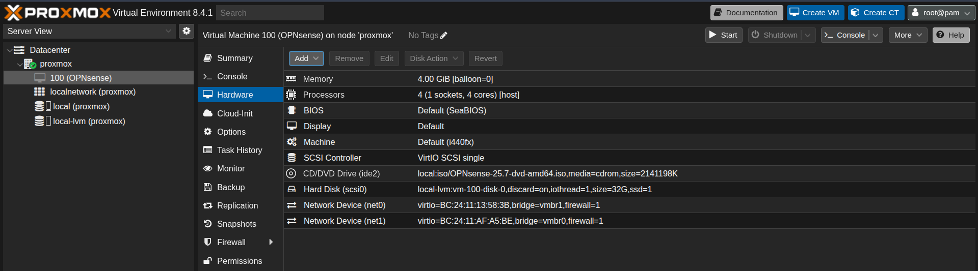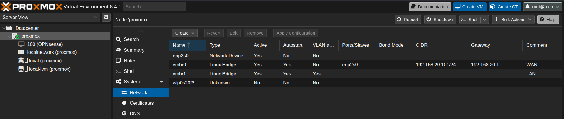 vmbr0. This network interface will serve as the WAN of OPNsense and is attached to the NIC of Proxmox.