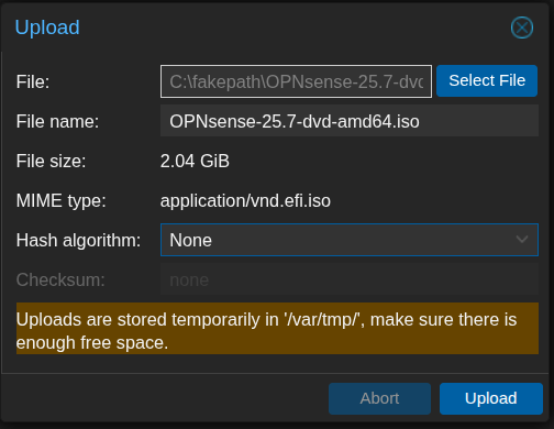 - Go to the Proxmox storage where ISO images are kept and upload the verified OPNsense ISO.
