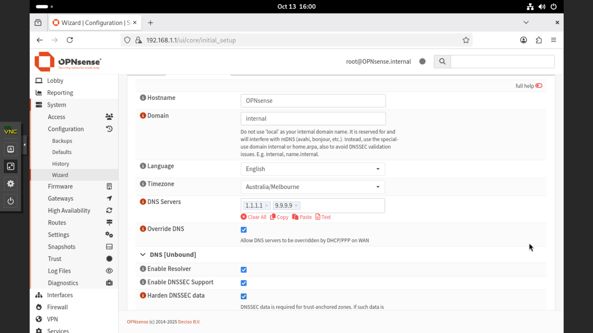 opnsense, and configure the DNS servers as1.1.1.1and9.9.9.9. These are public DNS servers provided by Cloudflare and Quad9, known for their speed, reliability, and enhanced privacy protection. Enable DNSSEC support and harden DNSSEC data. Keep the default settings for the remaining fields.