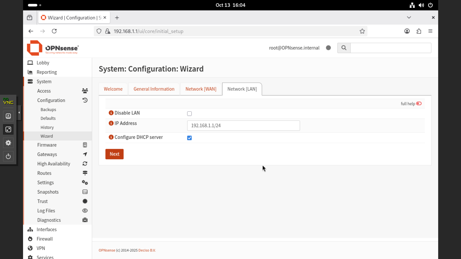 - Under Network – LAN, verify the OPNsense IP address and keep the default settings.