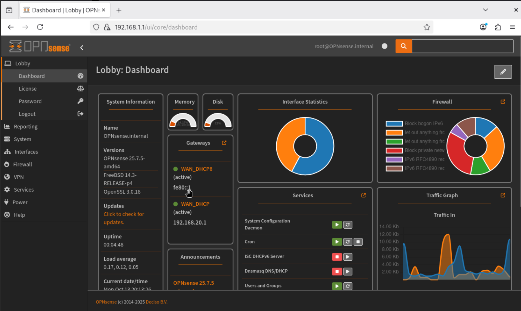 - After logging into the OPNsense web interface, you’ll arrive at the Dashboard. Under Gateway, you can see that both