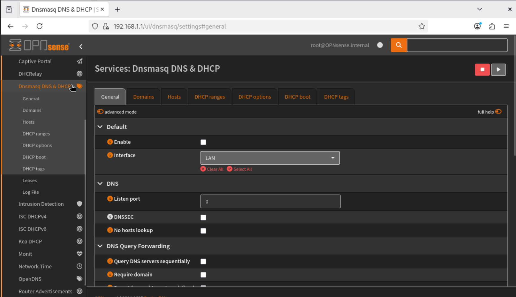 - Navigate to Services → DNSmasq DNS & DHCP → General, and stop the service running on the LAN interface.