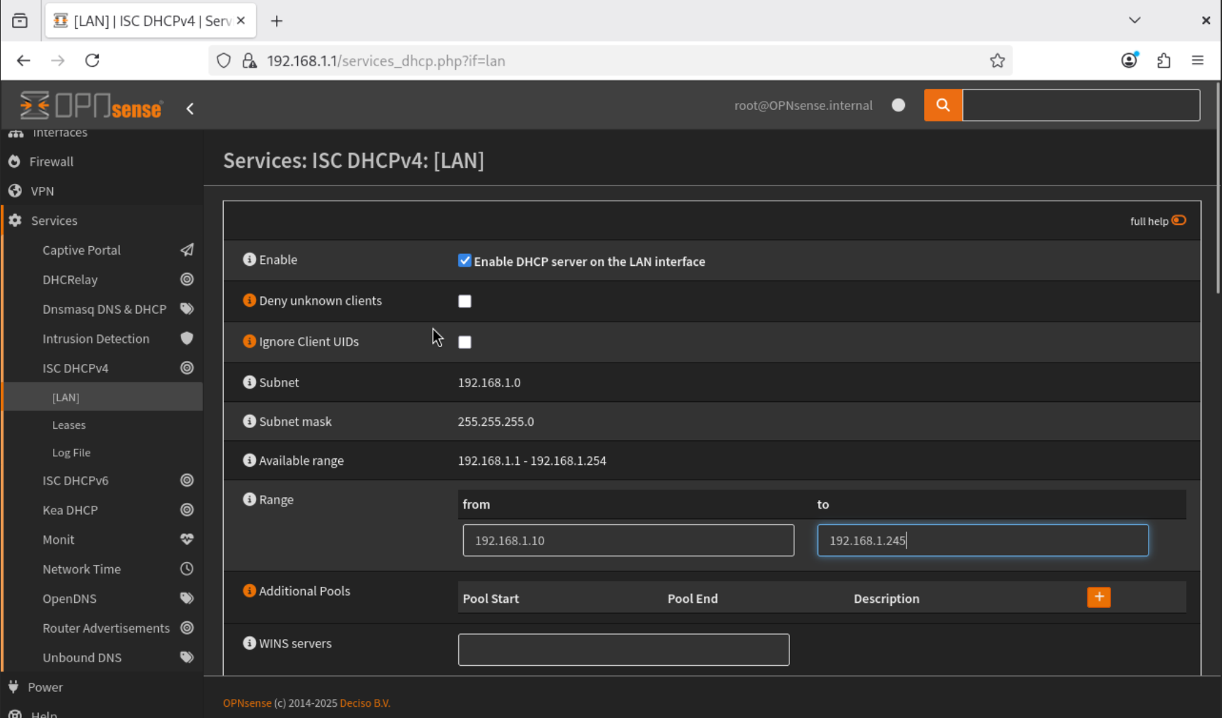 192.168.1.10to192.168.1.245. Save and apply the configuration to start the ISC DHCPv4 service.