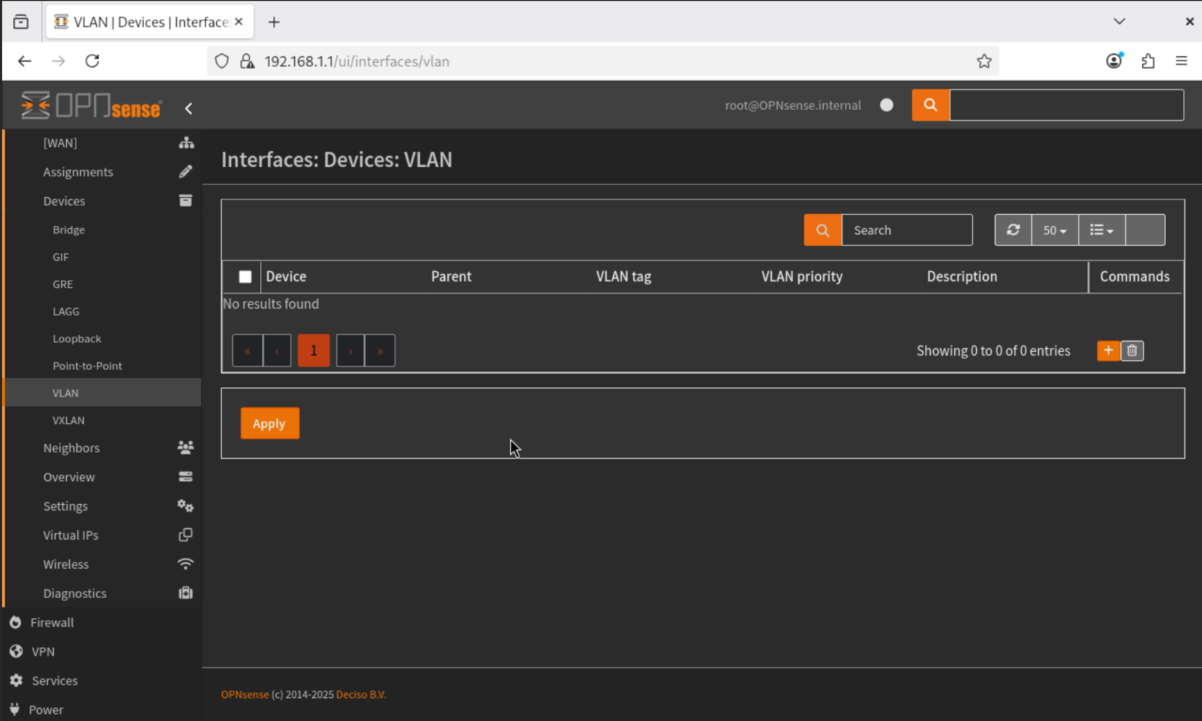 - To create a VLAN, navigate to Interfaces → Devices → VLAN.