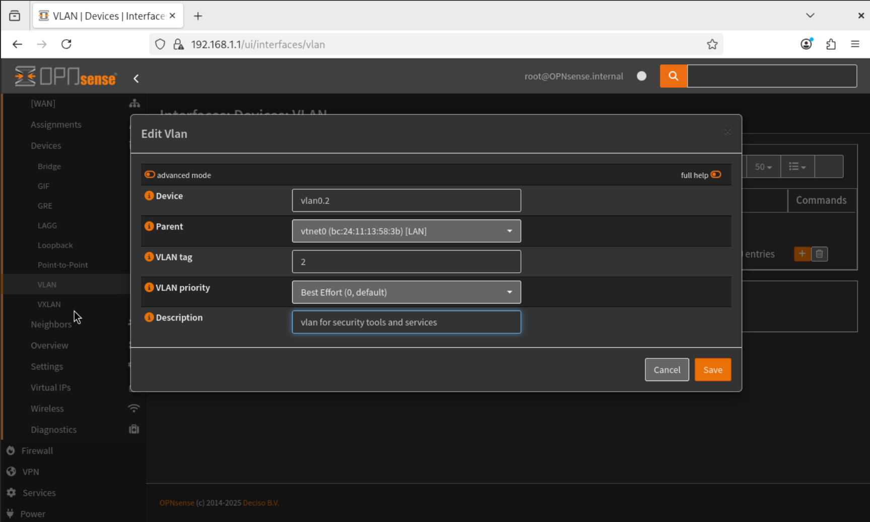 In this section, we’ll configure VLANs in OPNsense that will be used later for deploying tools like Wazuh and other monitoring services.