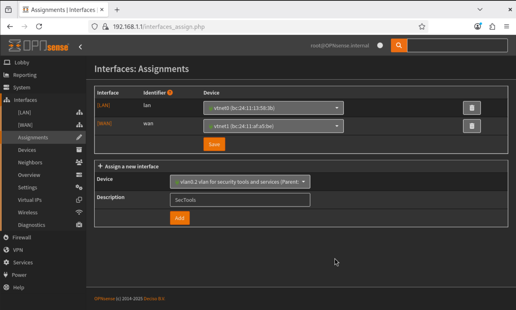 - Go to Interfaces → Assignments, add the newly created VLAN interface (