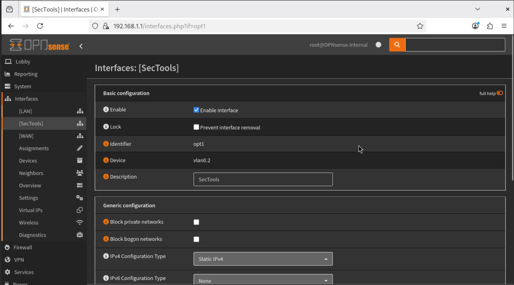 - Navigate to Interfaces → SecTools, enable the interface, and configure it with a Static IPv4 Address of