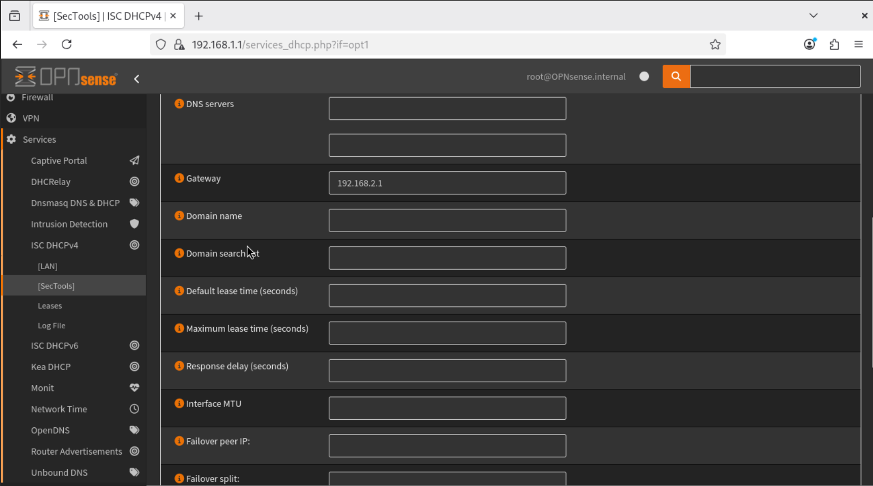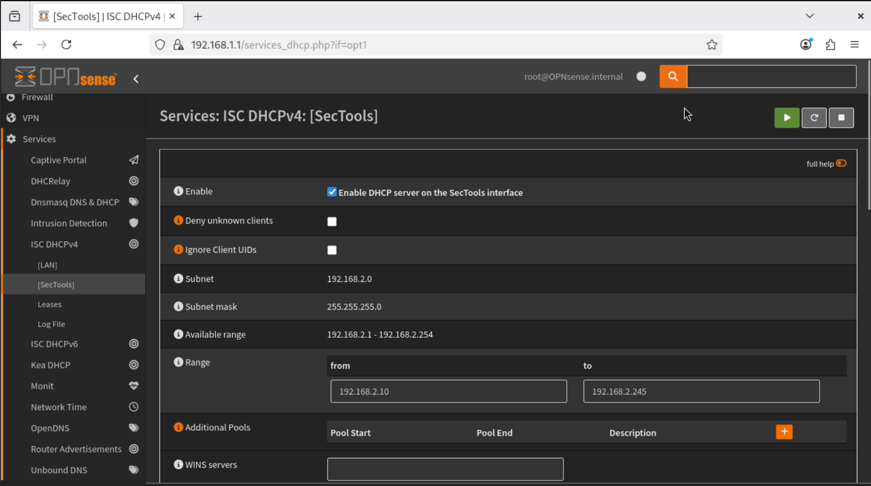 - Under Services → ISC DHCPv4 → SecTools, enable the DHCP server for this VLAN interface.