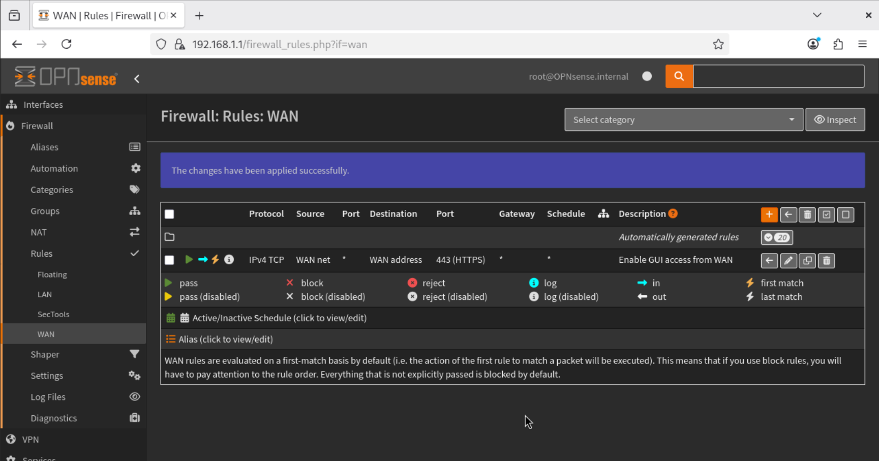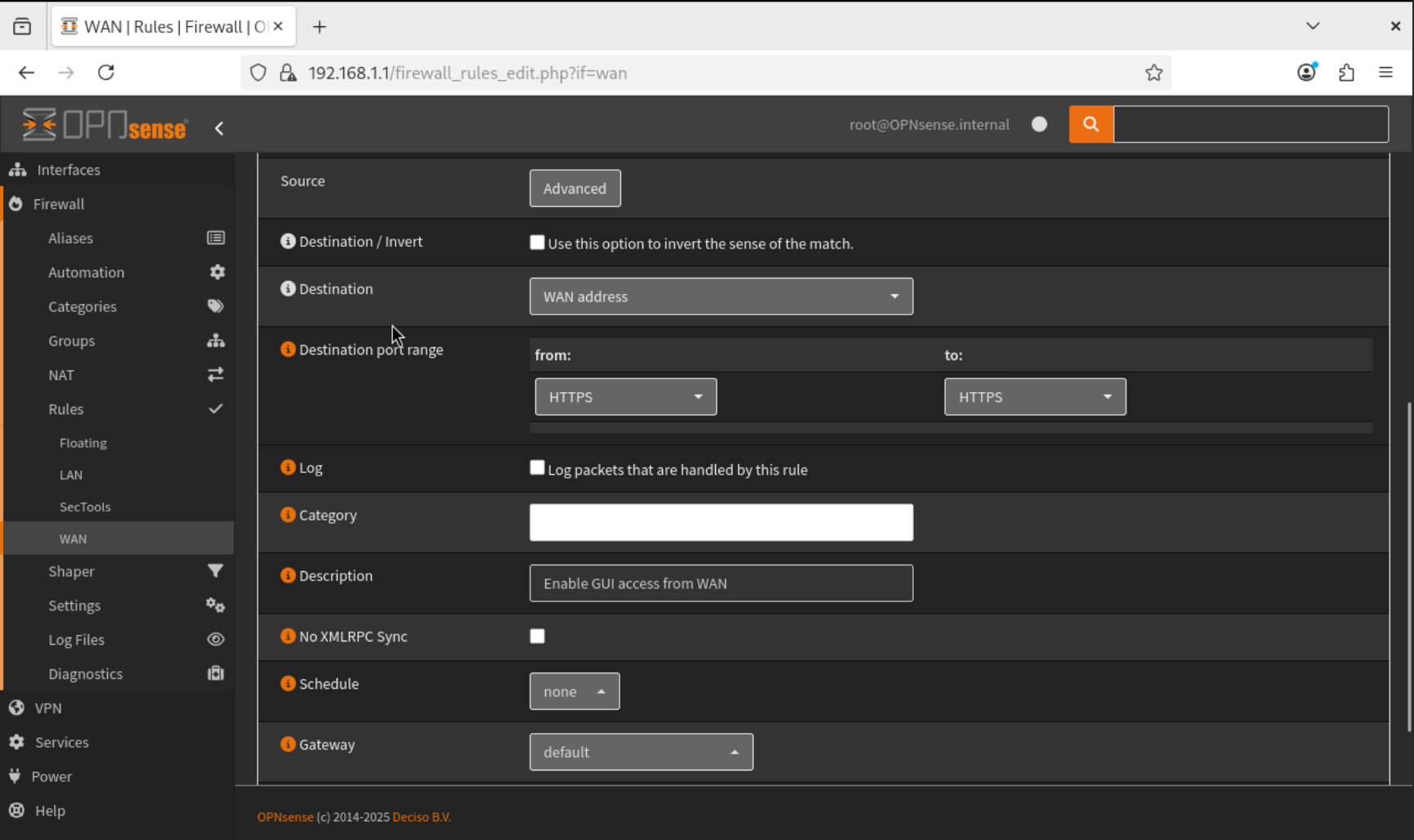 This configuration securely allows only HTTPS traffic from our home network to reach the OPNsense GUI.