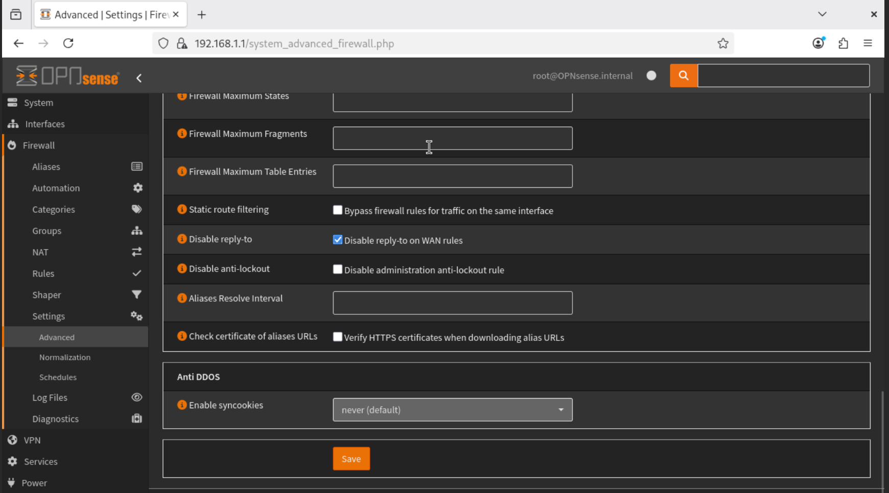 - Navigate to Firewall → Settings → Advanced, and Enable Disable Reply-to. This ensures stable remote access.