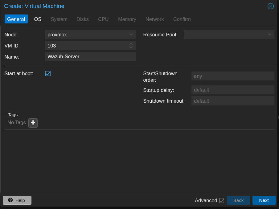 - Click “Create VM” and give it a name (ie. Wazuh-Server).