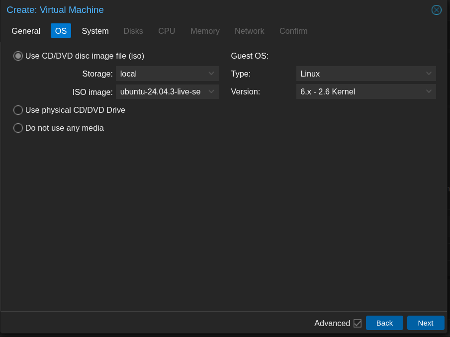 - Under the “OS” tab, select “Use CD/DVD disc image file (ISO)” and choose the uploaded Ubuntu Server ISO.