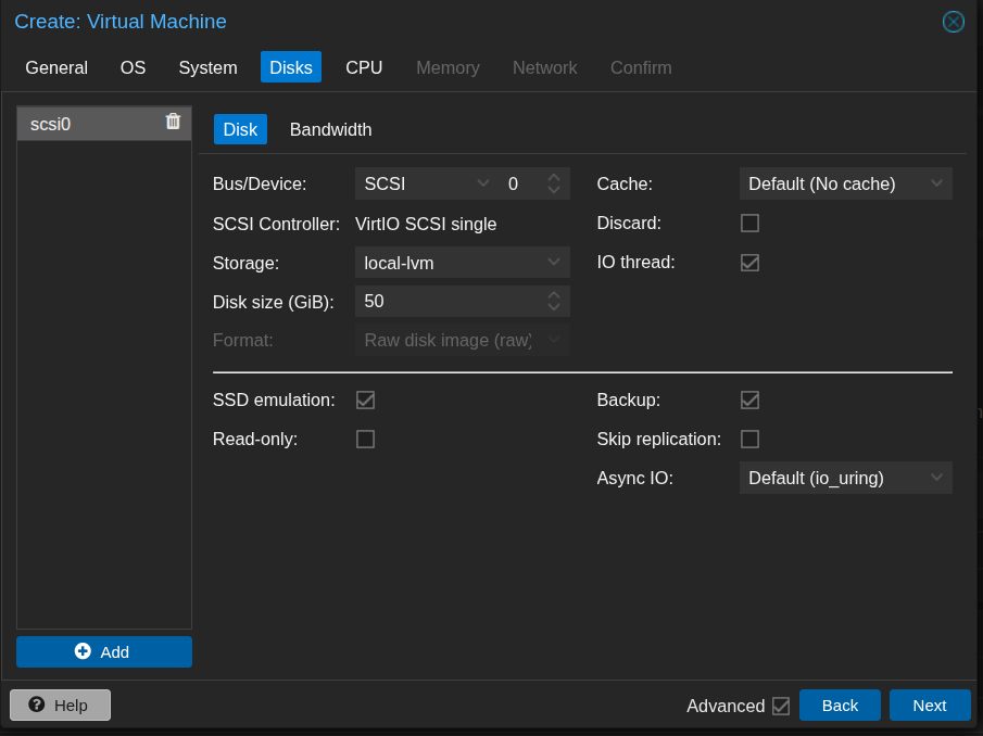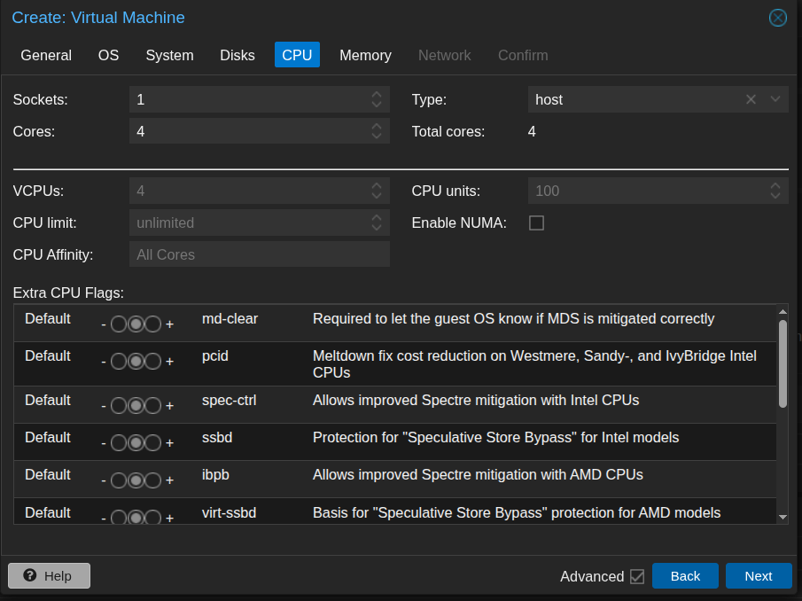 - Assign 4 CPU cores and set the CPU type to Host, as it exposes all real CPU features to the VM, ensuring maximum performance for Wazuh.