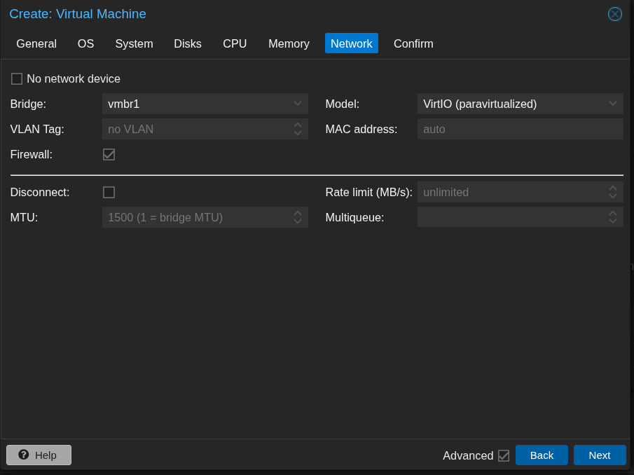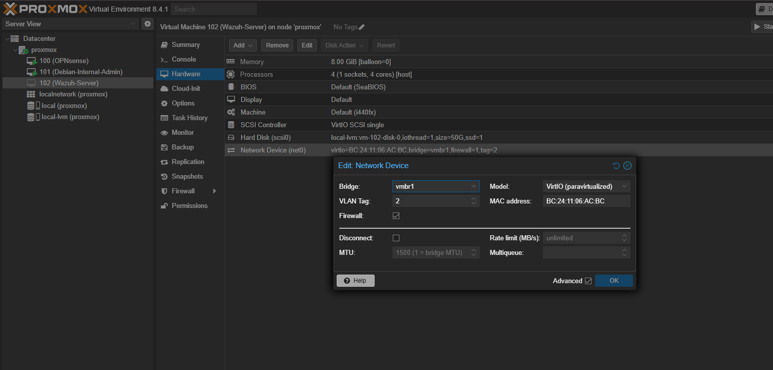 - Return to Proxmox, open the VM’s Hardware settings, select the network interface connected to