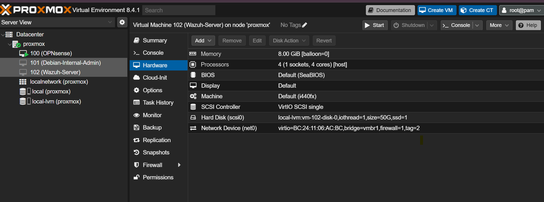 After creating the Wazuh server VM, we need to assign it a static IP address on the internal LAN and tag it with the appropriate VLAN for security tools and services.