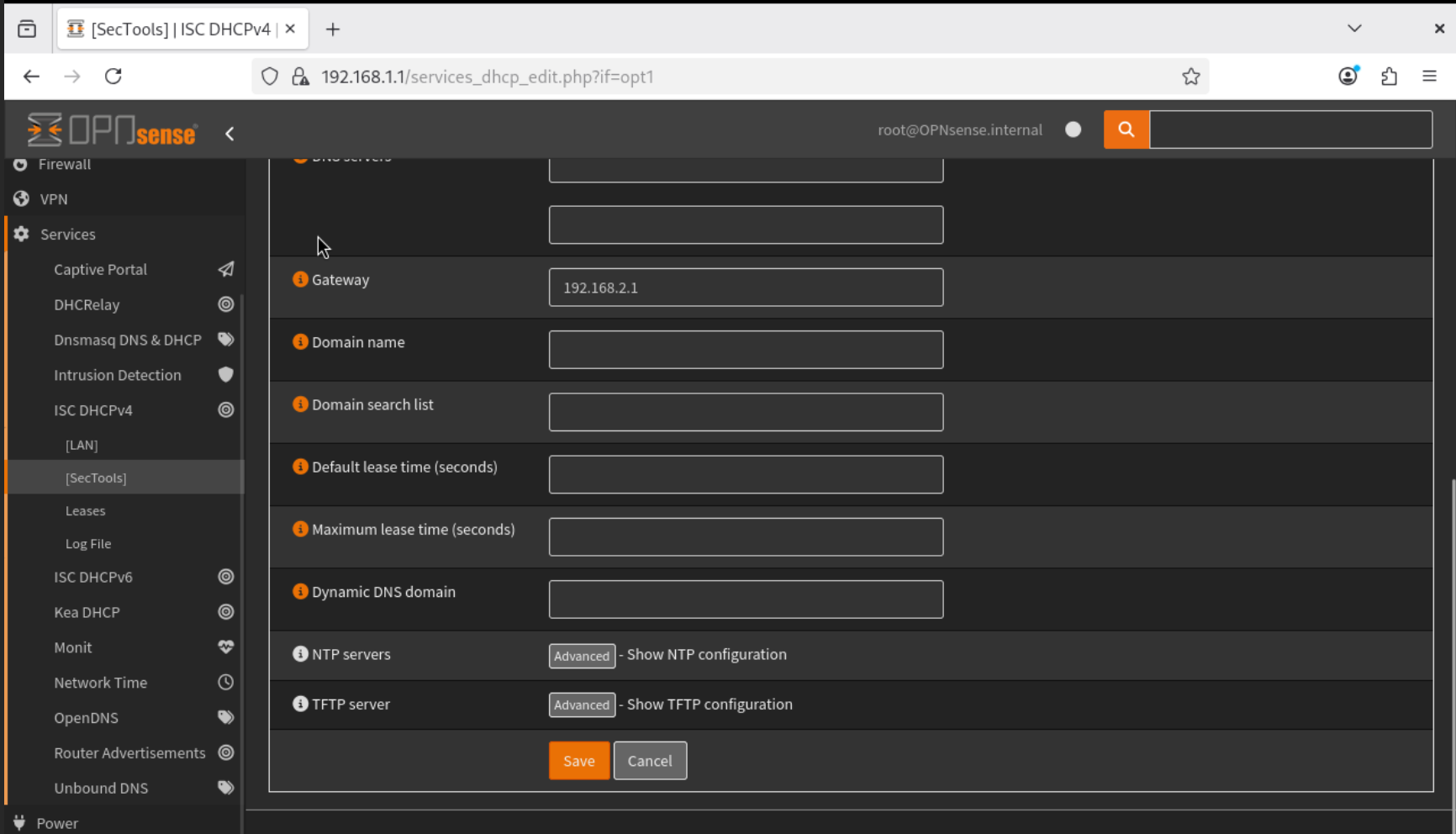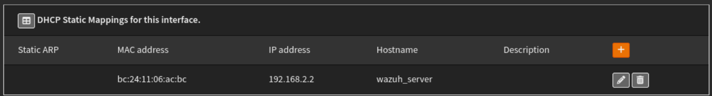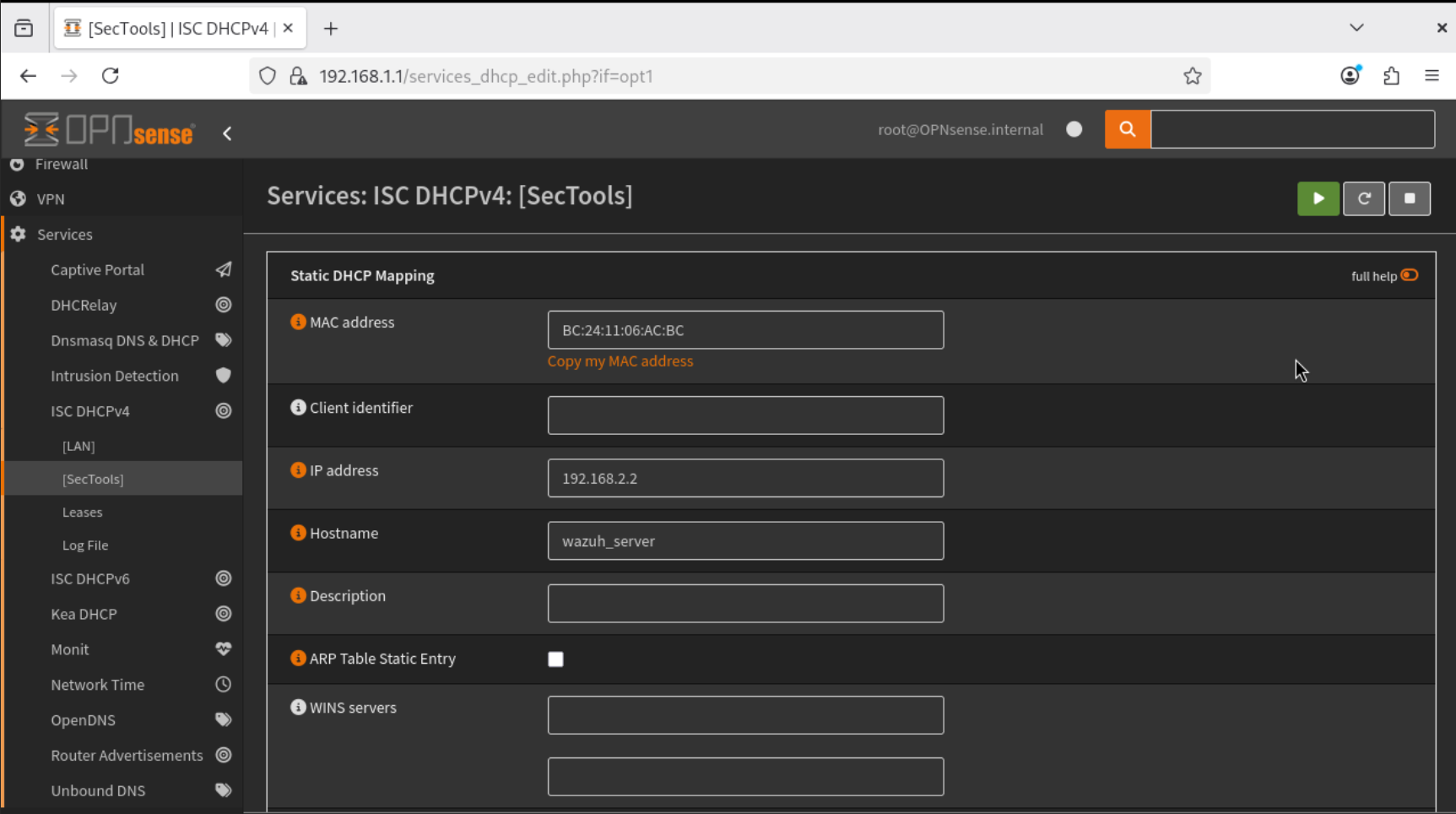 - In OPNsense, navigate to Services → ISC DHCPv4 → SecTools. Enter the MAC address of the Wazuh server VM and assign a static IP