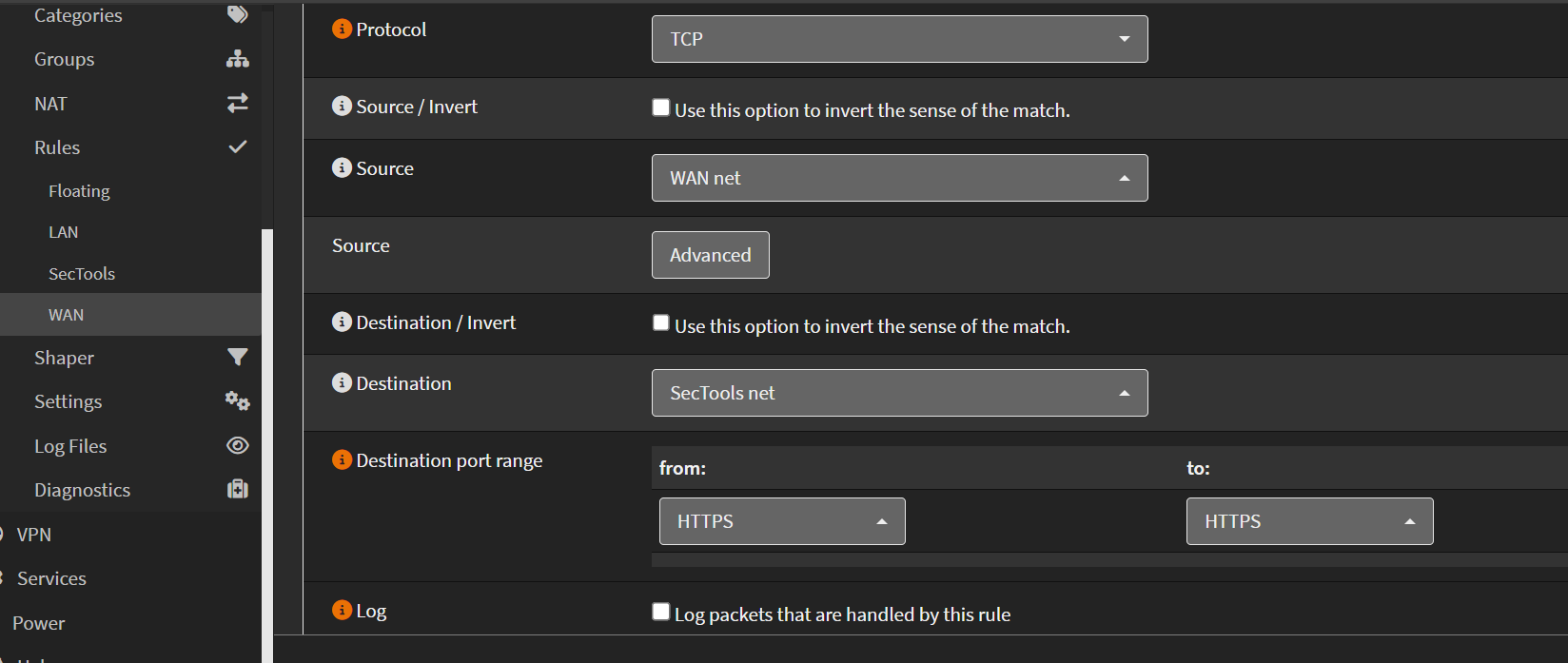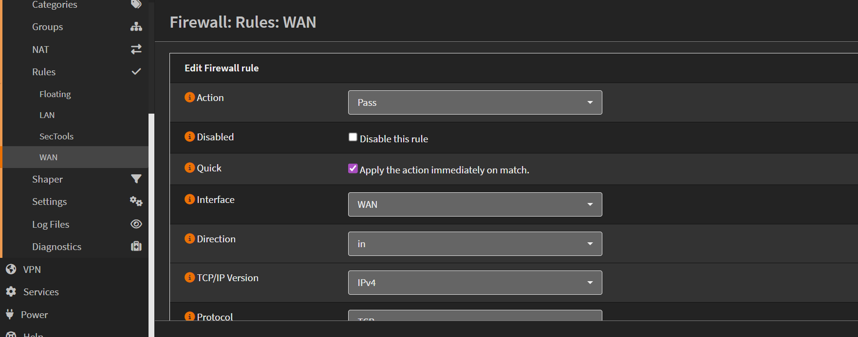 After adding the route, OPNsense needs a firewall rule that allows WAN → SecTools traffic.