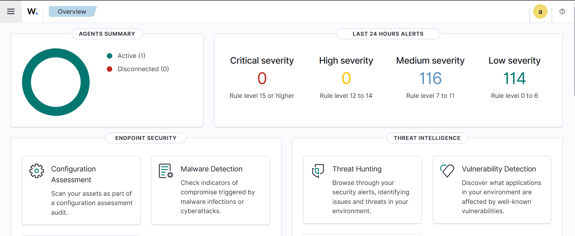 - Navigate to the Wazuh Dashboard → Overview to confirm alerts are being generated. You should see alerts categorized by high, medium, and low severity.